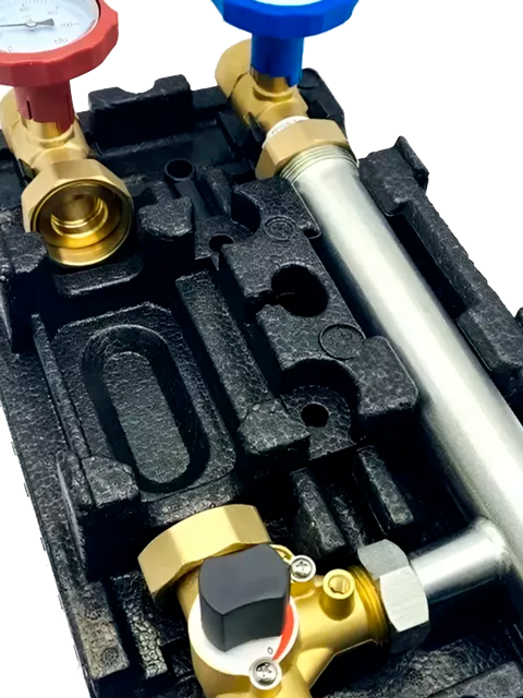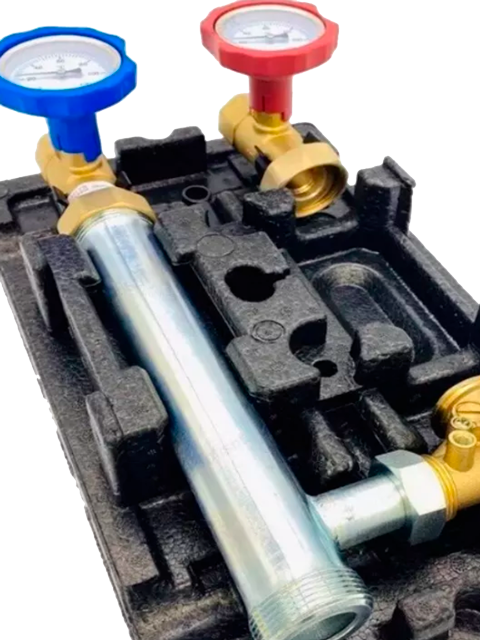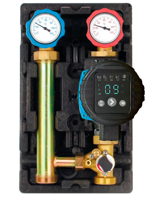 - два моноблока с фитингами на подающей и обратной линии cостоящие из отсекающего шарового клапана, термометра до 120°C, обратного клапана;